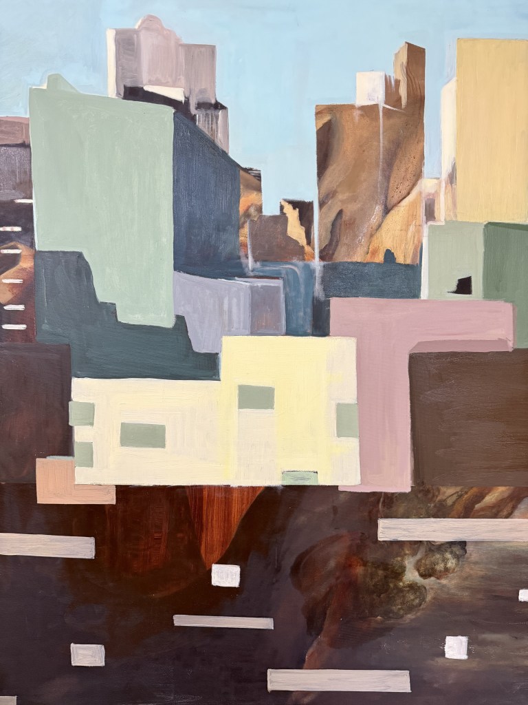 This artwork depicts city buildings, conveying that architecture is not cold or lifeless but holds countless hidden stories and interactions. The square building shapes resemble messages, symbolizing the multi-layered communication within the city. The dynamic colors beneath represent the flow of these stories and emotions inside the structures, expressing an organic and vibrant vitality. The overall composition reveals the warmth and pulse of the city, inviting viewers to sense the life concealed within the buildings and the untold narratives they embody.