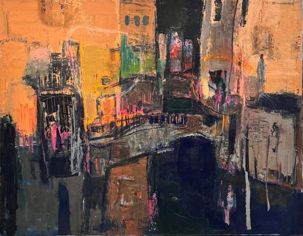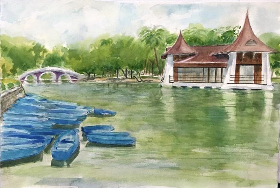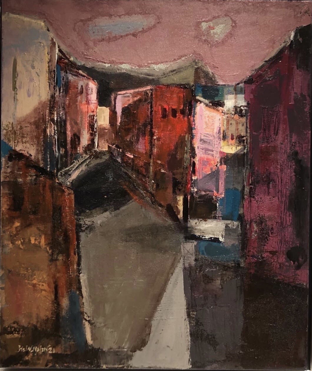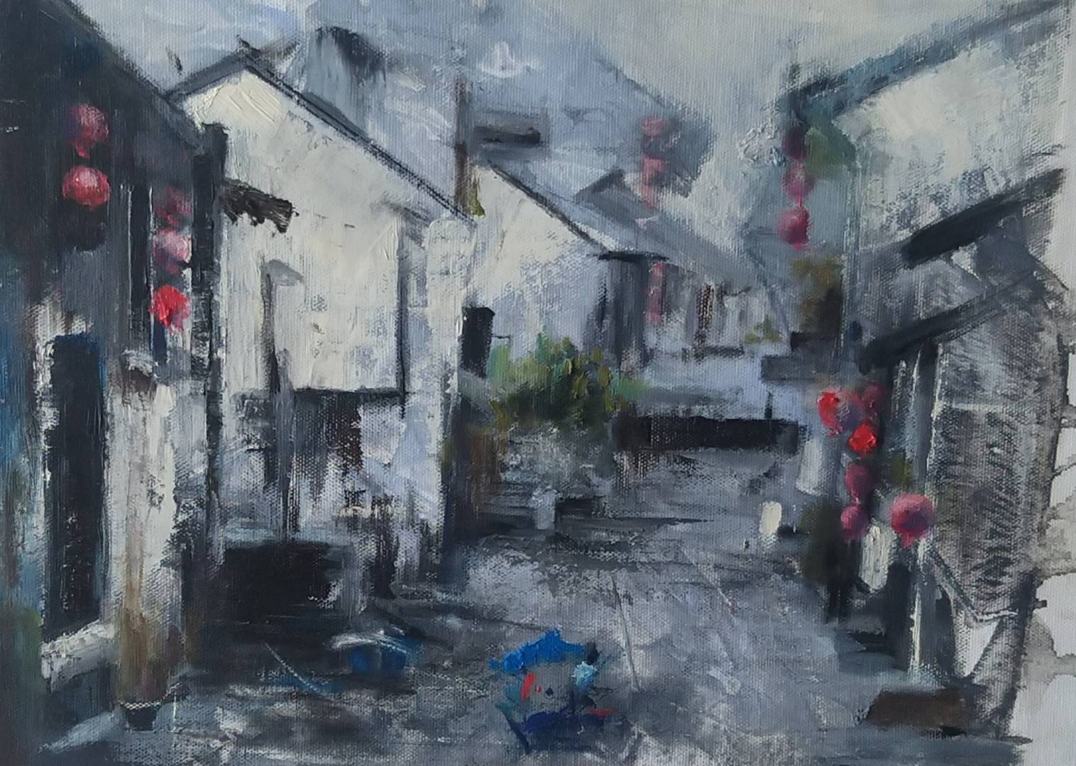 In the process of creation, I discover that the stronger, the faster the rhythm in my brush is, the more intense my emotions are shown. It is satisfying, however, I found it’s hard to bear the power of silence. With the composition of the buildings, the bridges and the street lamps in the picture, it’s like time telling a story tempered by the history of thousands of years. “It is the water city under the mask."
