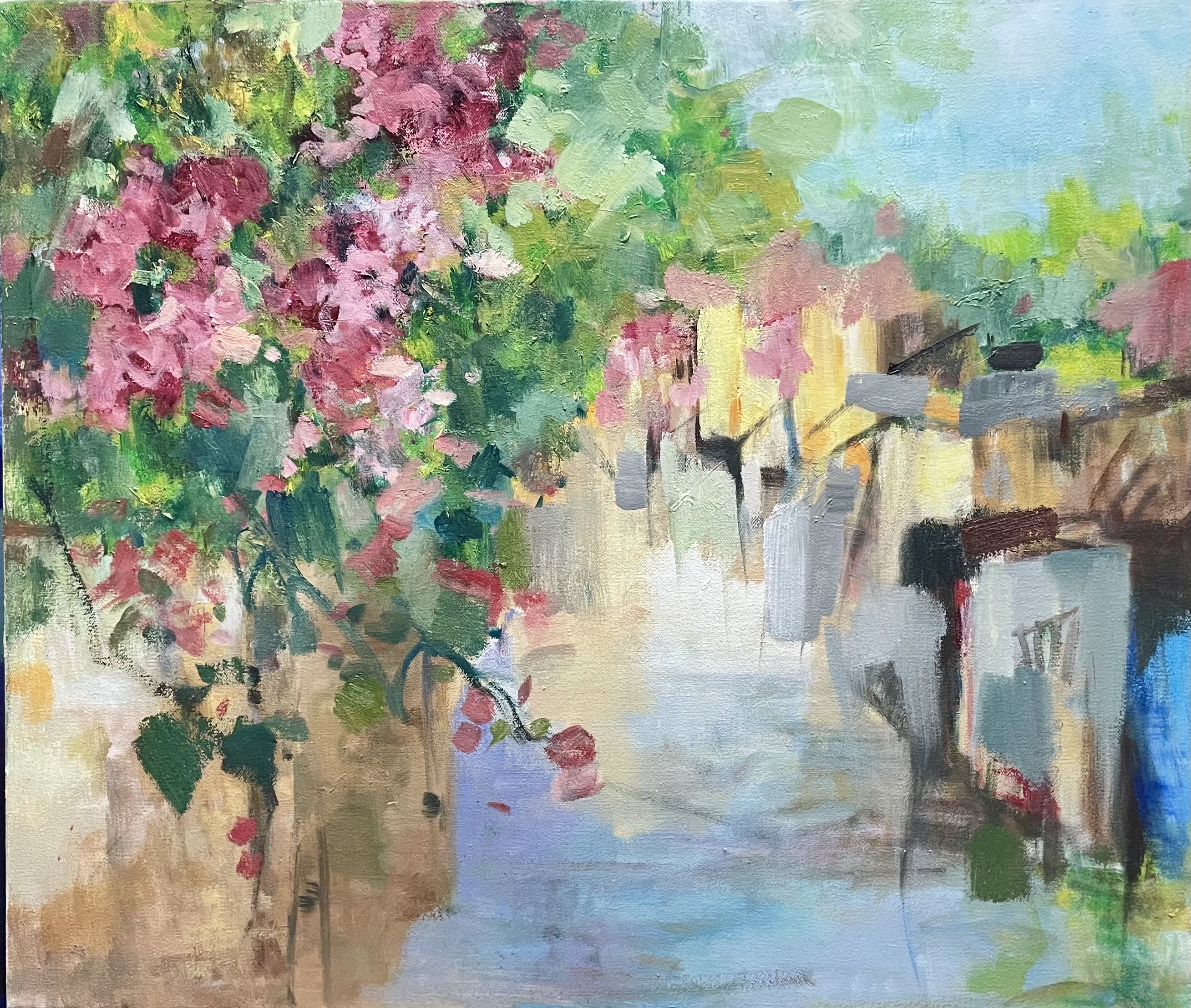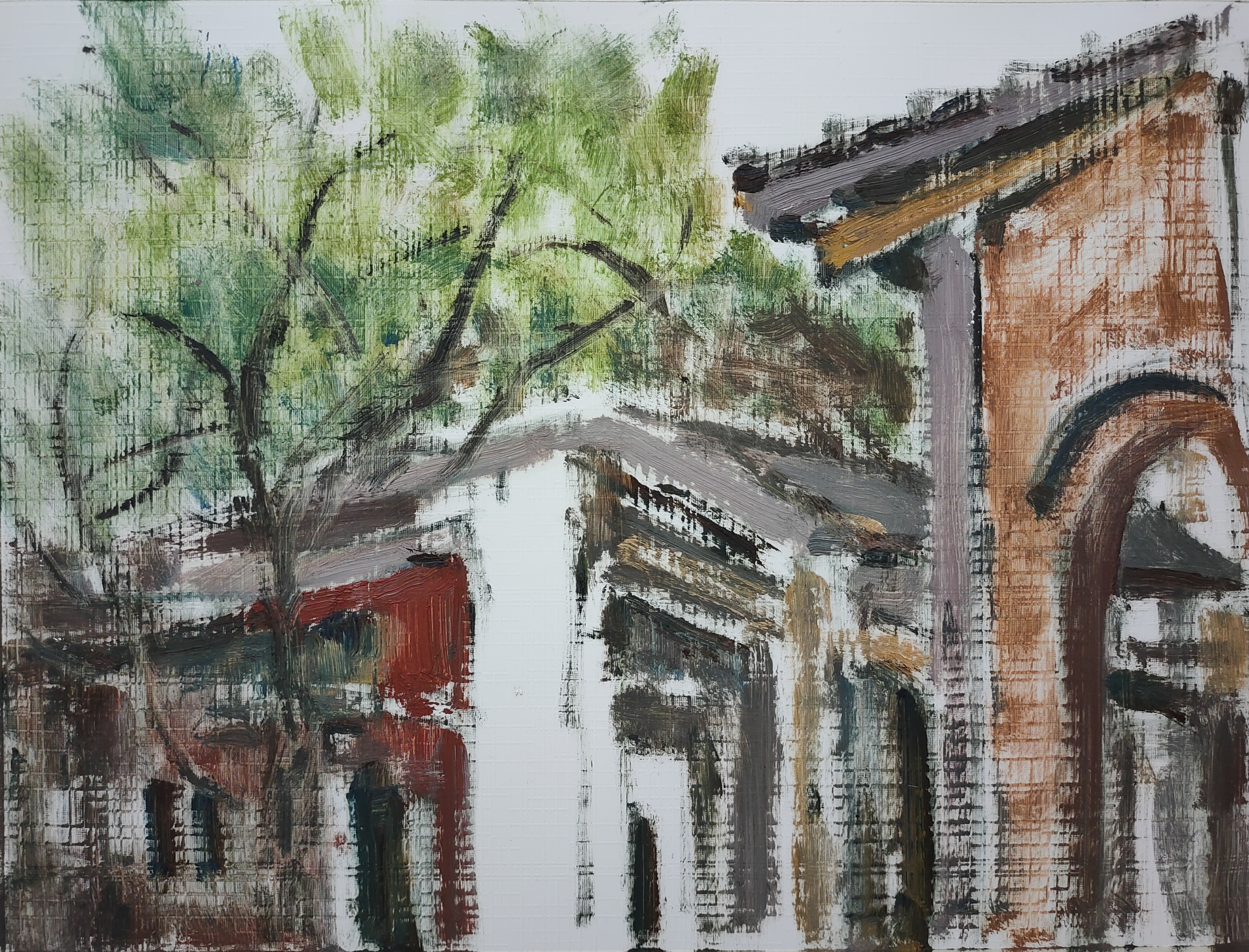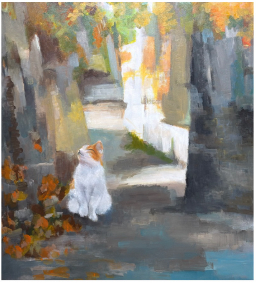 In a quiet alley, nestled between scattered buildings and slanted paths, sunlight filters through layers of tree shadows, creating an interplay of light and shade. The color palette weaves together shades of gray with warm tones, adding depth while evoking a sense of tranquility and warmth. The cat in the painting sits silently in a corner, as if it has found its own cozy space, savoring a moment of serenity in a leisurely afternoon. This artwork not only captures the unique charm of alleyways but also conveys a sense of ease and harmony in life.