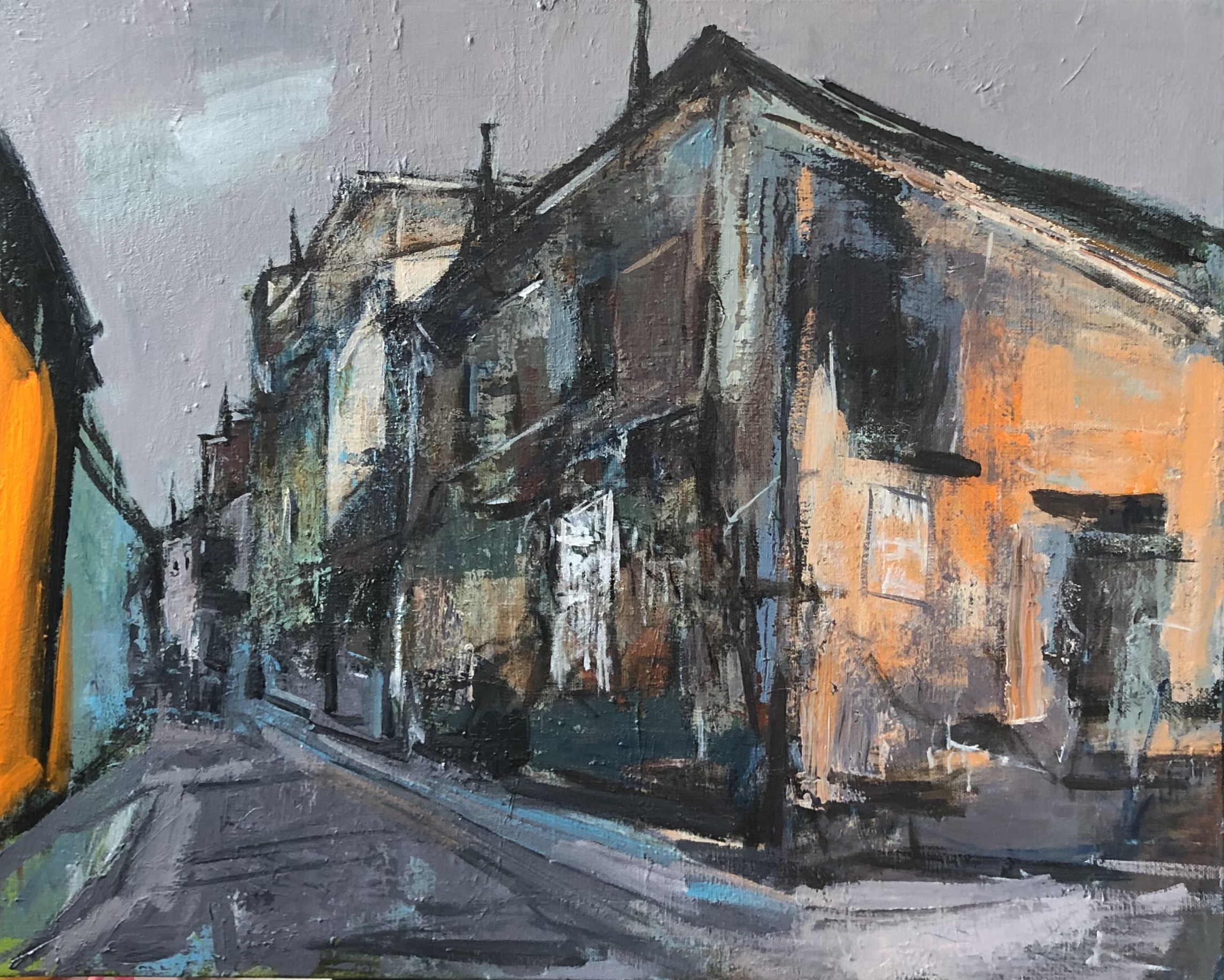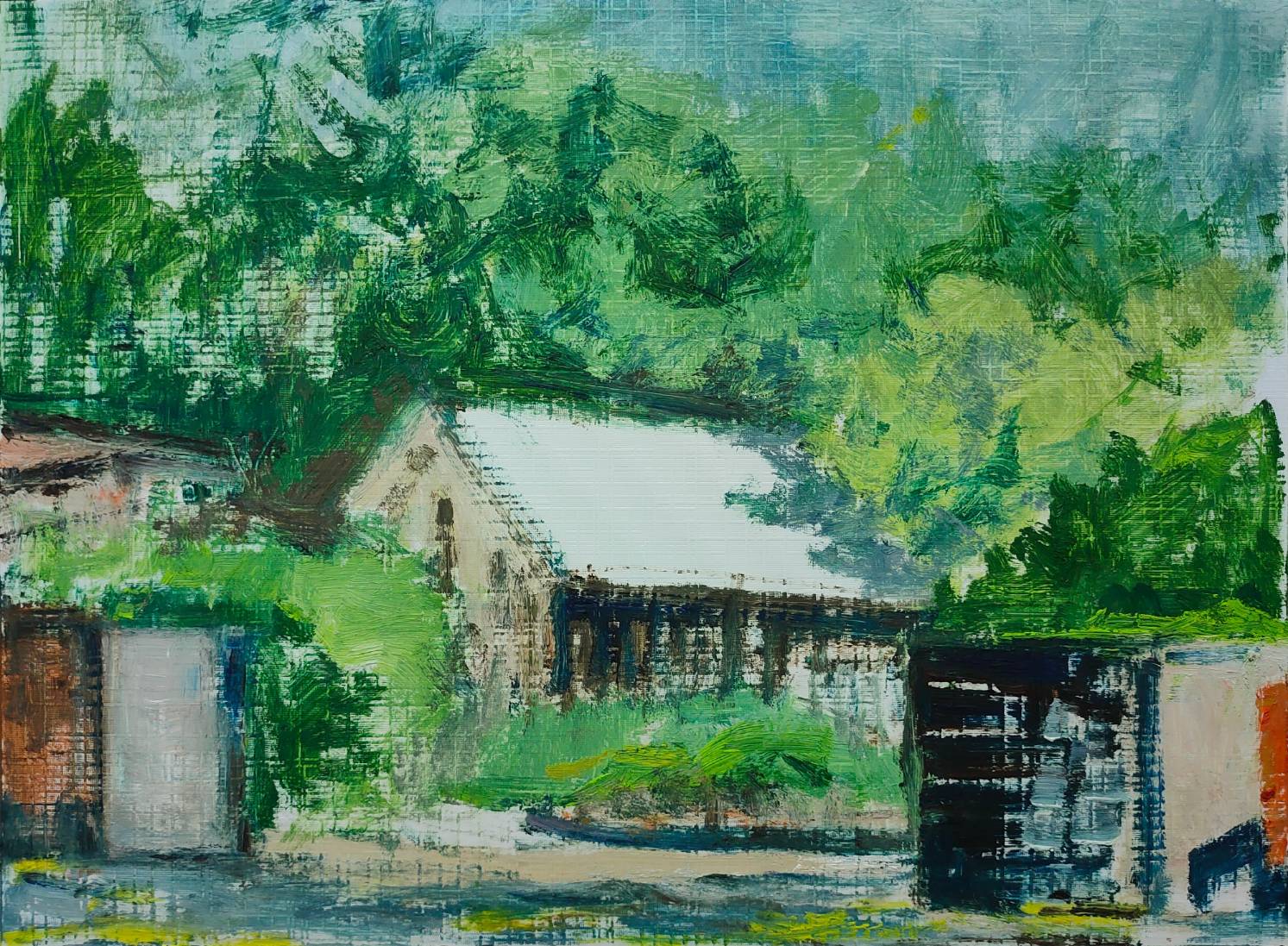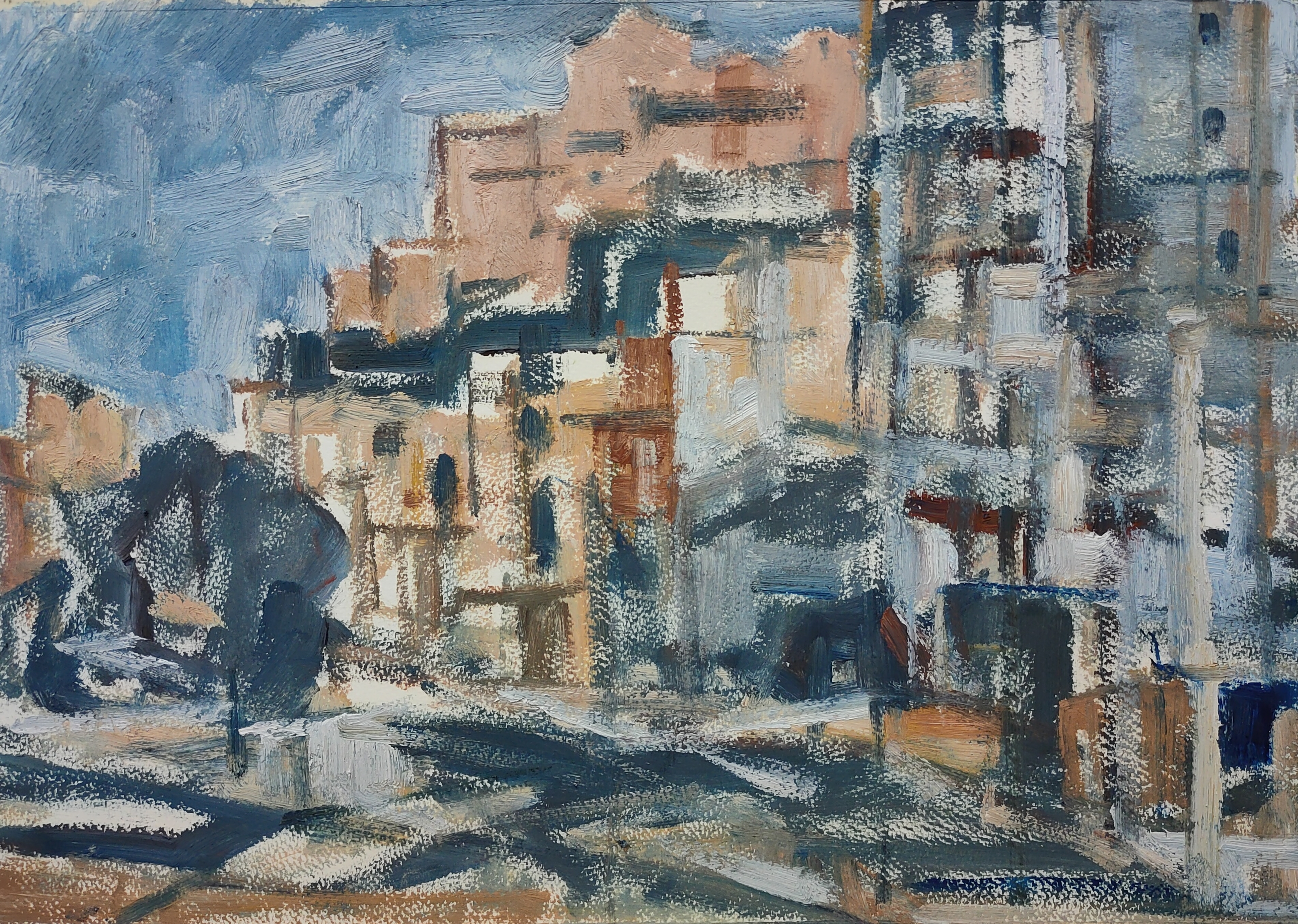 In a quiet alley, nestled between scattered buildings and slanted paths, sunlight filters through layers of tree shadows, creating an interplay of light and shade. The color palette weaves together shades of gray with warm tones, adding depth while evoking a sense of tranquility and warmth. The cat in the painting sits silently in a corner, as if it has found its own cozy space, savoring a moment of serenity in a leisurely afternoon. This artwork not only captures the unique charm of alleyways but also conveys a sense of ease and harmony in life.