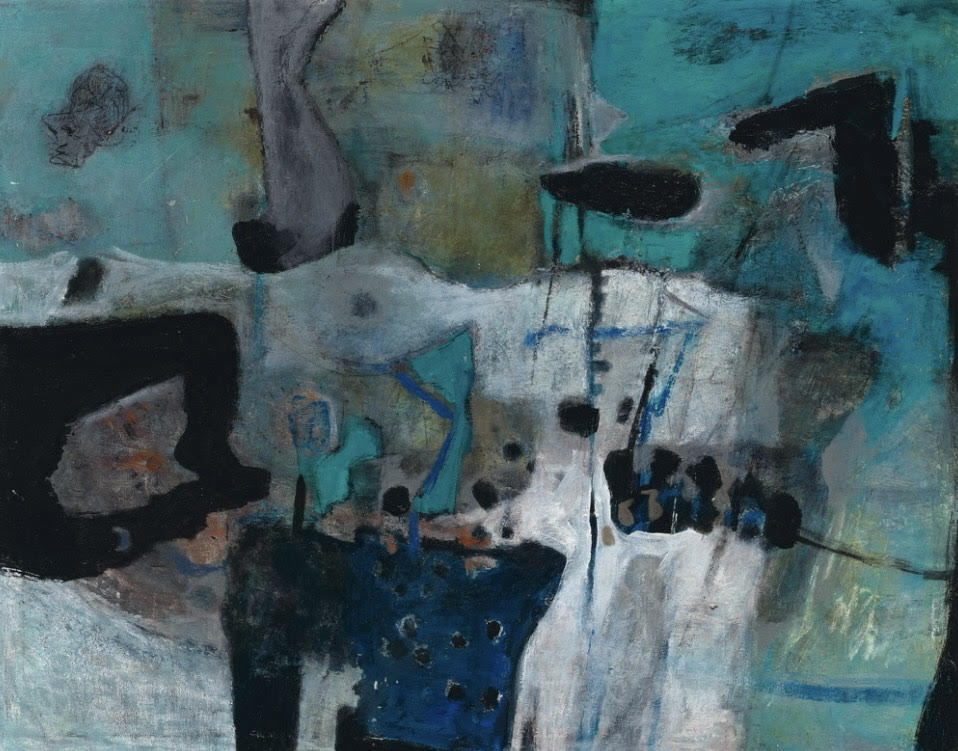 This work in teal tones is an emotional journey. The interweaving of blocks of color has a calm appearance, yet contains deep fluctuations, like a tangle in order. The stacking of each layer of color and the direction of the brushstrokes describe memory as a familiar yet unfamiliar forest, tightly surrounding the shackles of daily life, sometimes extending outwards, like an impulse to break free, but always restrained by the inner heart. is bound by order.