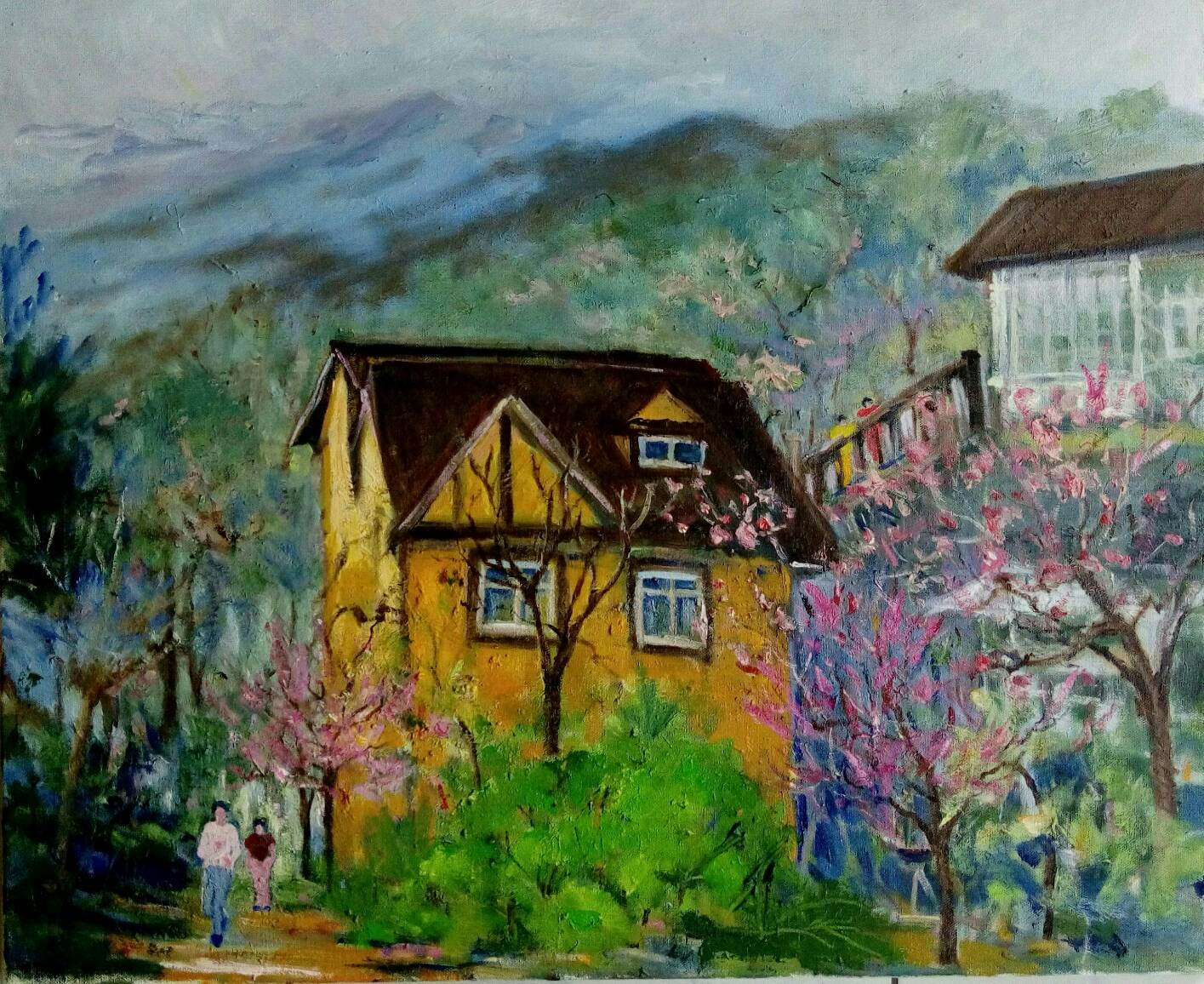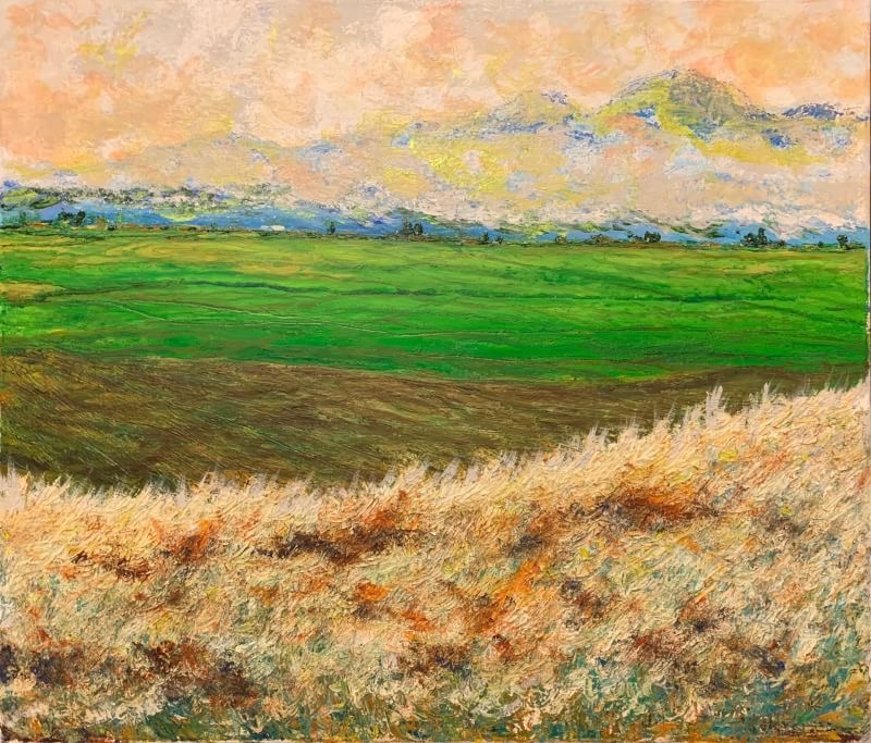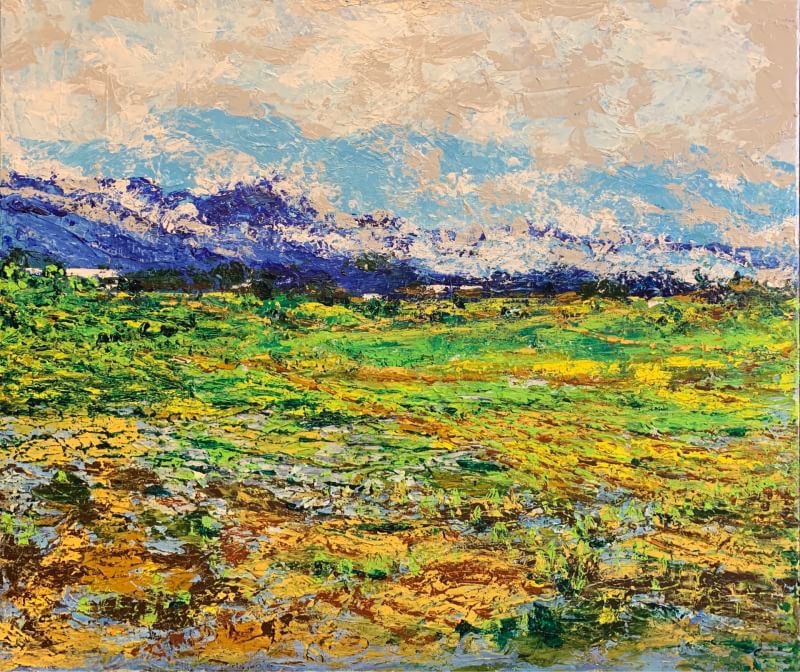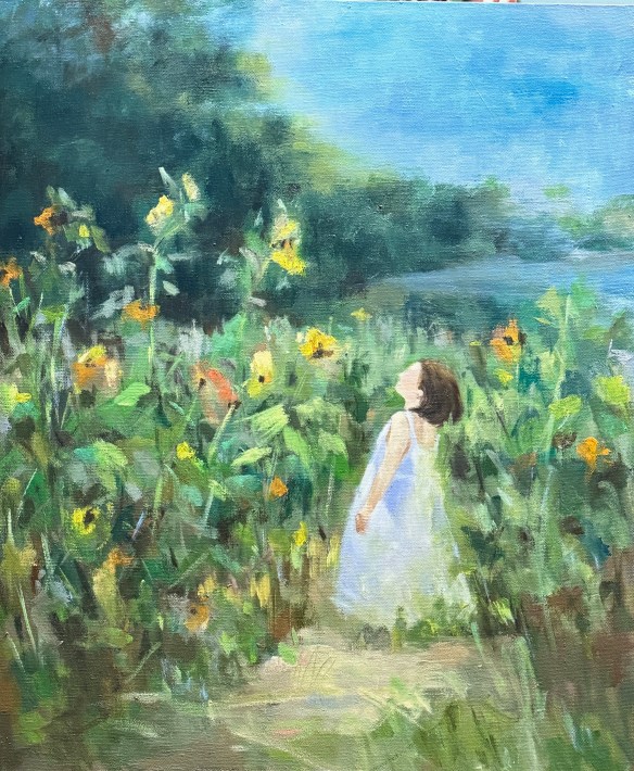 This artwork aims to express the profound connection between humanity and nature. The distant mountains offer a sense of deep visual extension, suggesting the unknown and infinite possibilities of the future. The vibrant flowers in the foreground symbolize the diversity and richness of life. The presence of a little girl amidst the flowers imbues the scene with a carefree innocence, drawing the viewer back to a state of pure mind, reminiscent of the intimate bond with nature during childhood. The afternoon light and shadows not only enhance the depth of the painting but also symbolize the passage of time and the eternity of the moment. Through the combination of these elements, the artwork emphasizes the beauty of nature and its resonance with the human spirit, reminding us to cherish the present and appreciate every simple, beautiful moment. In this painting, nature, childhood, and time come together to form a quiet, poetic composition.