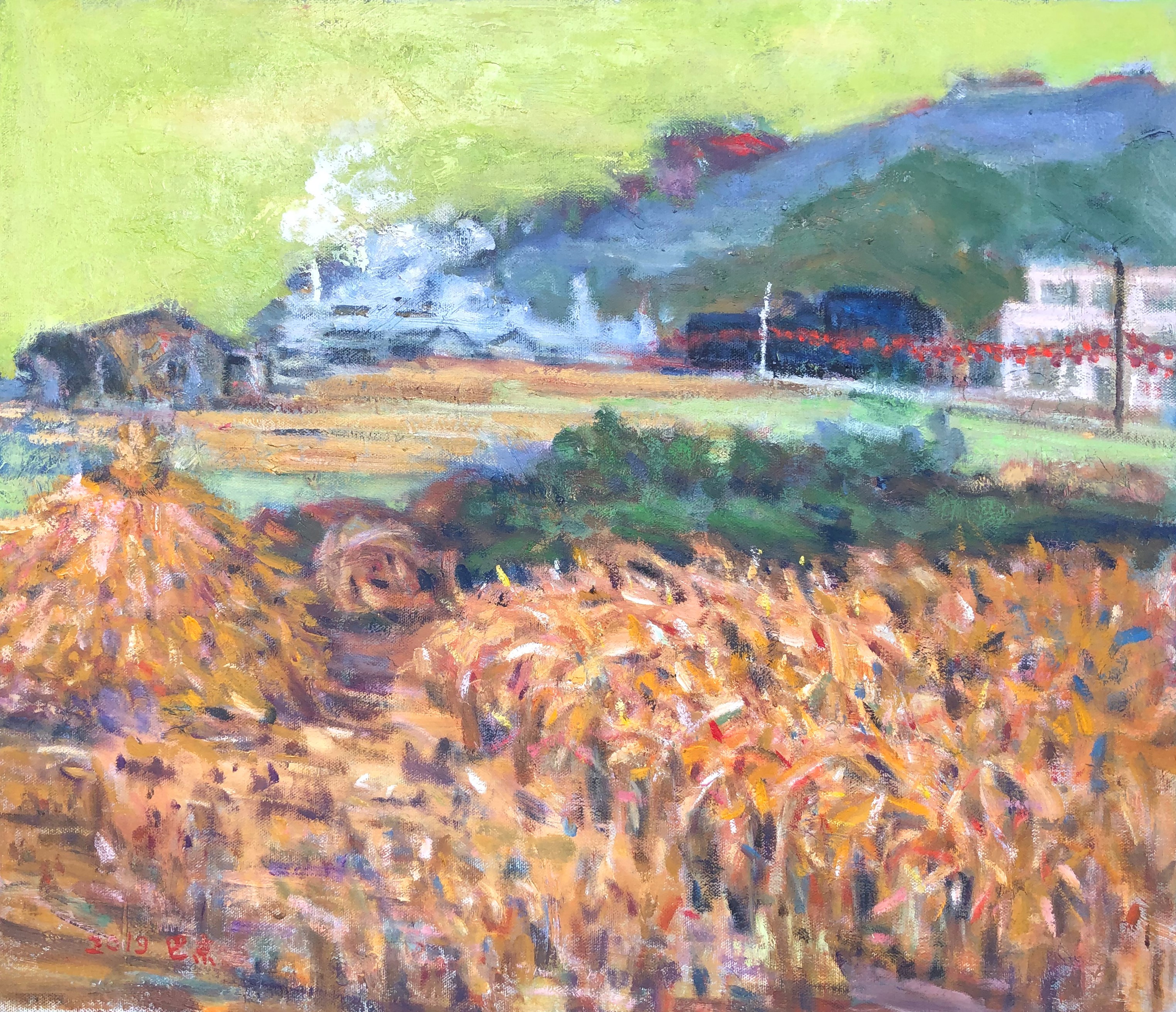 Hill Town Story The small town lies on the edge of a stream and a forest. After the new railway was completed, commuters stopped coming by train. The old station still stands quietly in its original place. A couple walks by, and the woman says, “Oh! it’s already autumn."