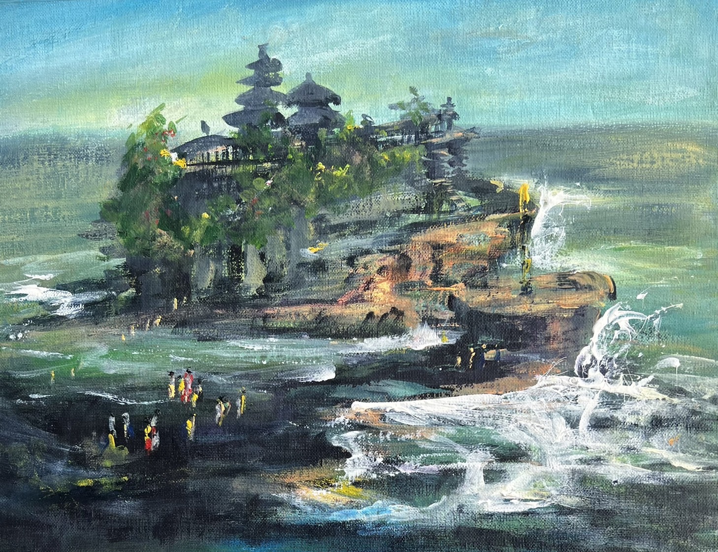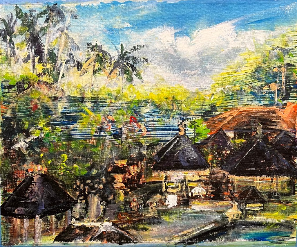 峇里島是充滿魅力的一個旅遊聖地,當地獨特宗教文化和建築風格、壯麗的自然景觀,這次旅遊象洞景點在咖啡廳往下看象洞,快速寫生完成的一個作品。